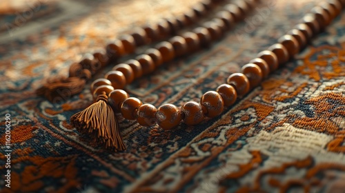Close-Up of Prayer Beads on Ornate Persian Rug with Tassels. AI generated illustration