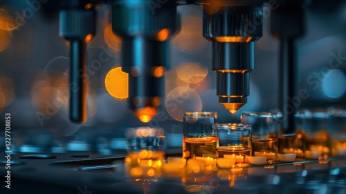 Close-up of precision machinery in a laboratory setting with glowing elements and blurred background