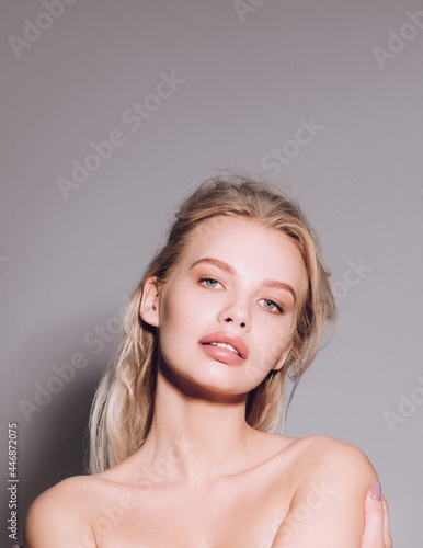 Closeup of pretty young woman face with blue eyes, blonde hair, has nude makeup, perfect soft skin, standing shirtless with bare shoulders, looking at camera. Studio grey background