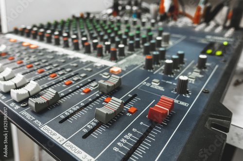 Close-up of professional concert mixing console, equipment for sound mixer control