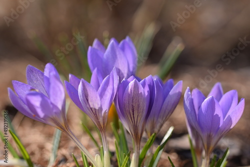 Closeup of purple snow crocus flowers, violet crocus flowers in early spring garden, spring awakening.