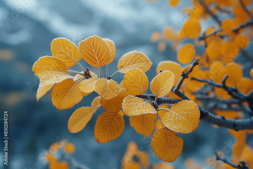 Close-up of quivering aspen leaves, with a backdrop of snow-capped mountains, emphasizing the contrast between seasons.