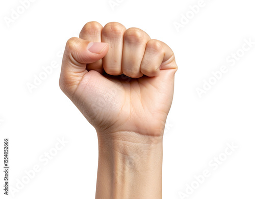 Close-up of raised clenched fist with medium skin tone, front view, isolated on transparent background PNG