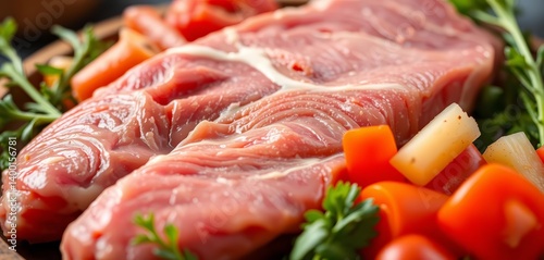 Close-up of raw meat and vegetables prepared for canine consumption, raw vegetables, kibble