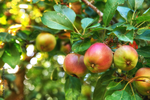 Closeup of red and green apples ripening on a tree in a sustainable orchard on farm in a remote countryside. Growing fresh, healthy fruit produce for nutrition and vitamins on agricultural farmland