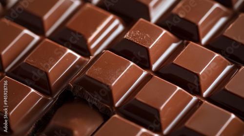 Close-up of rich dark chocolate squares arranged neatly on a surface, showcasing their glossy texture in natural light