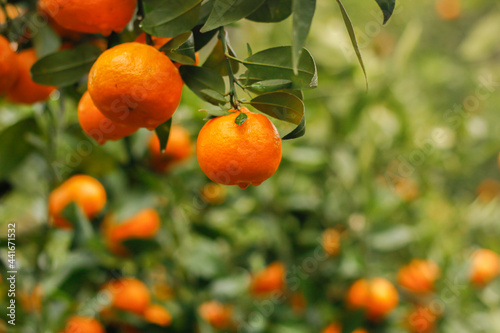 Closeup of ripe mandarin oranges with green leaves hanging on the branch in morning light.