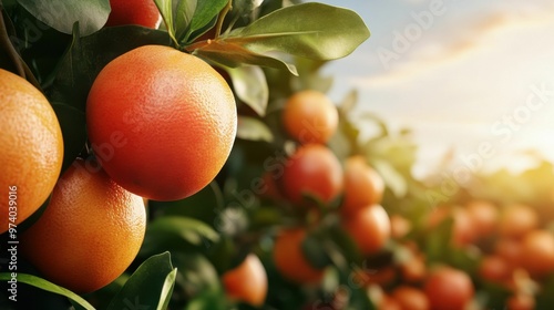 Close-up of ripe orange citrus fruit hanging on tree branches in a sunlit orchard, surrounded by green leaves and warm light, ready for harvest..