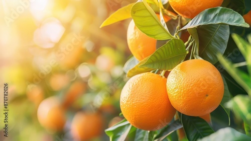 Close-up of ripe oranges hanging from a tree branch, bathed in warm sunlight.