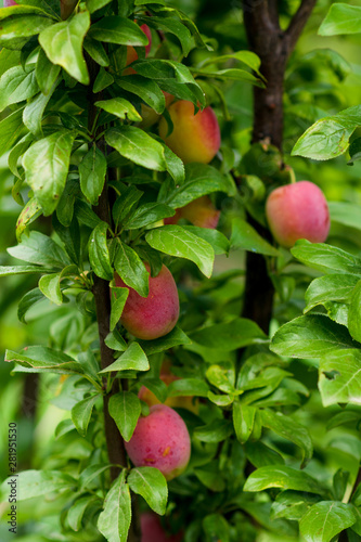 Closeup of ripe plums on a branch in a fruit garden.
