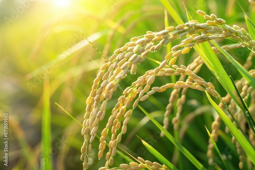 Closeup of ripe rice plants in a sunny field with vibrant green leaves and golden grains. Agriculture, crop growth, food production, farming, natural resources, agribusiness concepts.