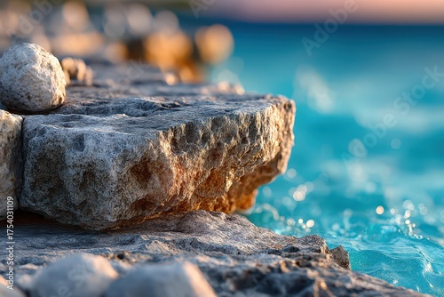 Close-up of rocky shore with azure water, creating a tranquil, beautiful beach scene, emphasizing nature's textures and serene ambiance of a seaside landscape.
