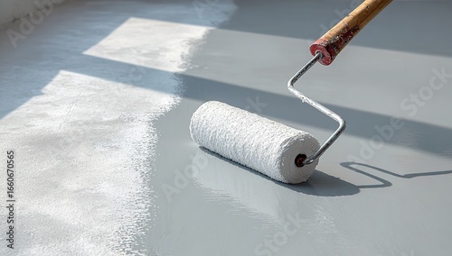 Close-up of roller painting grey resin floor with epoxy varnish on concrete surface