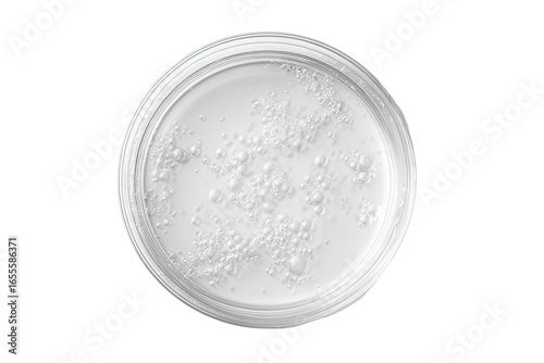 Close-up of round, clear glass jar. White, foamy liquid inside, with numerous small bubbles