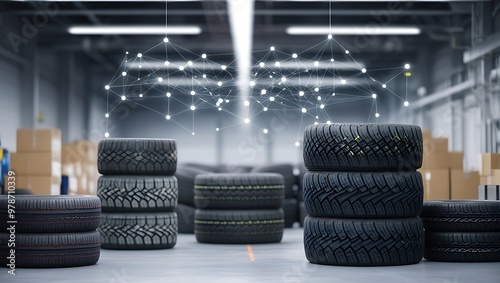 Close-up of rubber tire stacks at white modern car service center, Tire fitting background with stack of car tires. Copy space