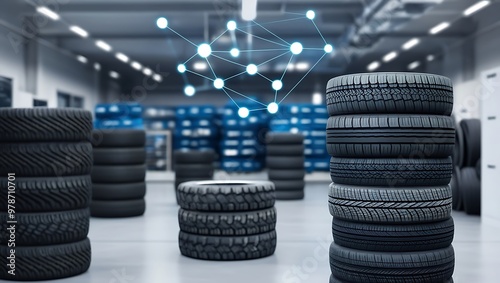 Close-up of rubber tire stacks at white modern car service center, Tire fitting background with stack of car tires. Copy space