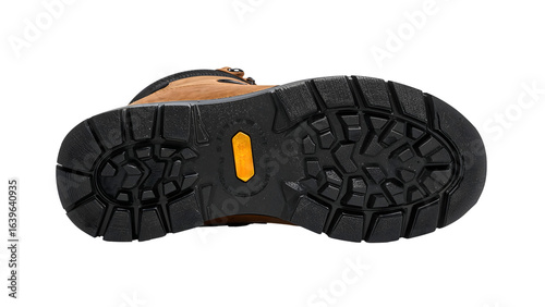 Closeup of rugged hiking boot sole with deep tread pattern for outdoor traction and durabilityon the transparent background