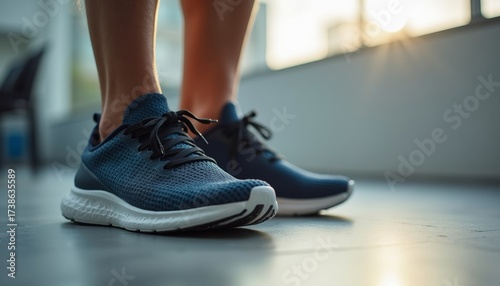 Close-up of running shoes worn by person on floor indoors