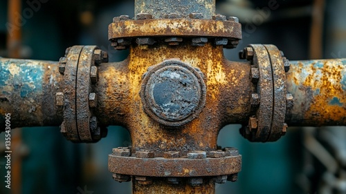 Close-up of rusty, aged industrial pipes connected with flanges and bolts.