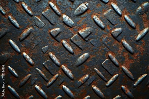 Close-up of rusty metal diamond plate with raised pattern showing weathered texture and industrial wear