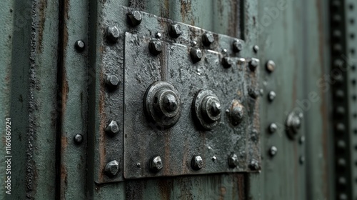 Close-up of rusty metal plate with bolts and rivets on weathered green surface.