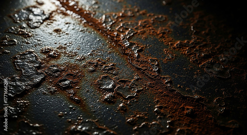 Closeup of rusty metal surface with peeling paint and dark background
