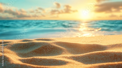 Closeup of sand on beach and blue summer sky Panoramic beach landscape Empty tropical beach and seascape Orange and golden sunset sky soft sand calmness tranquil relaxing sunlight summ : Generative AI