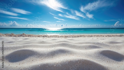 Close-up of sandy beach with blue sea and sky, panoramic tropical beachfront scene with space for copy, featuring white soft sand, calm and tranquil atmosphere under relaxing sunlight, evoking a