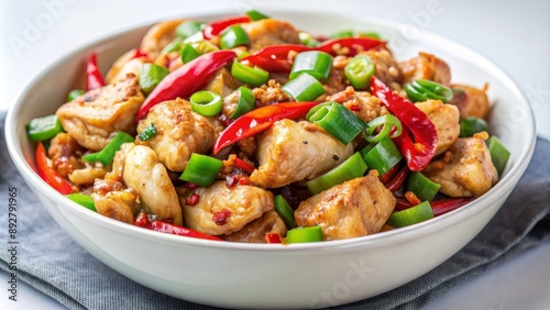 Close-up of Savory Chicken Stir-fry with Red Chiles and Green Onions, Chinese Cuisine, Spicy Dish, Asian Food, Chinese Food