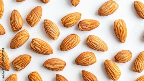 Close-up of scattered almonds on a white background, showcasing their texture and natural brown color in a minimalist style.