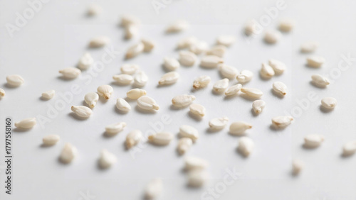 Close-up of scattered sesame seeds on a bright white surface, macro shot.