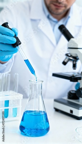 Close-up of scientist pipetting blue liquid in lab setting.