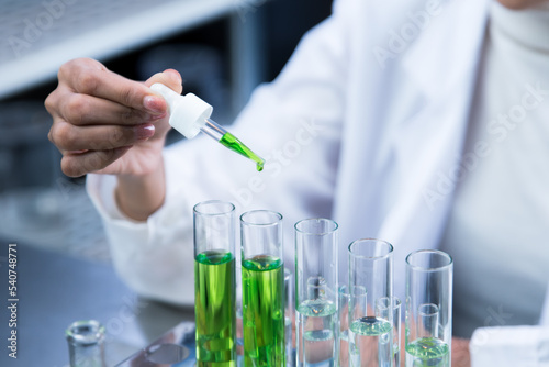 Close-up of Scientists are dripping organic plant extracts into test tubes and plates in the laboratory, Researchers testing plant-based drugs.