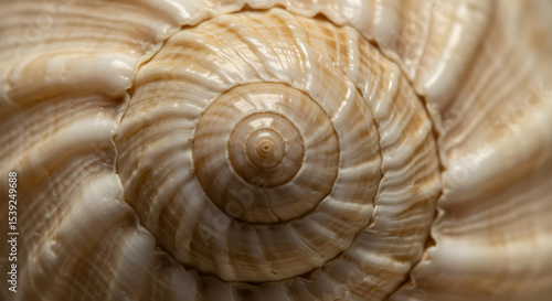 Close-up of seashell surface with natural patterns and texture, macro ocean object in beige and white tones