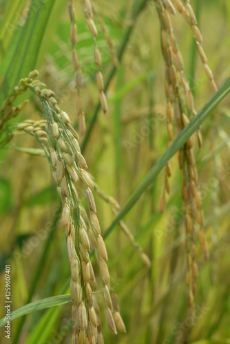 Close-up of seeds on rice cobs. Beautiful golden rice fields and rice cobs. Fresh background with green leaves.