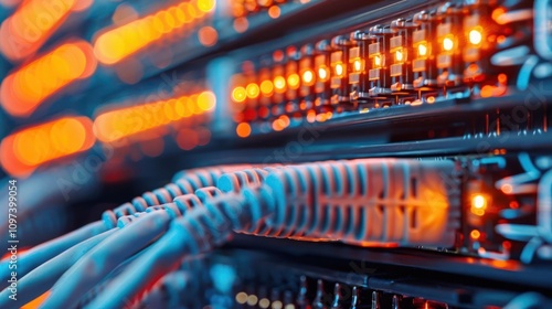 Close-up of server connections with illuminated ports, highlighting data transmission.