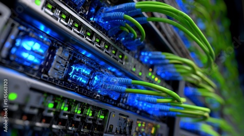 Close-Up of Server Rack with Blinking LED Lights and Cables