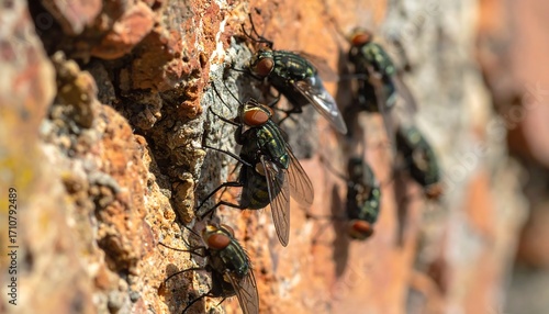 Close-up of several flies clinging to a weathered brick wall, showcasing intricate details of their bodies and wings against a textured surface.