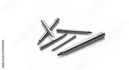 Close-up of several metal, cylindrical pins with pointed and ridged ends, scattered on white