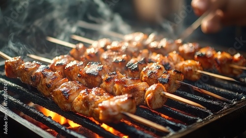 Close-up of several skewers with grilled meat pieces cooking over hot flames on a barbecue grill with smoke rising
