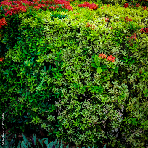 close-up of shaped manicured shrub with coral flowers ixora landscaping background. landscape design perennial plant with blooms.