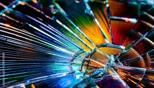 Close-up of shattered glass, with vibrant light refractions creating colorful patterns on the surface.