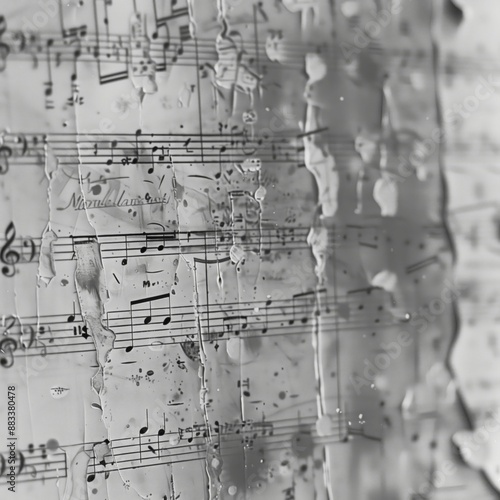 Close-up of sheet music covered in water droplets, evoking a sense of melancholy and artistic expression. Perfect for music-themed projects.