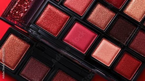 Close-up of shimmering red eyeshadow palettes, beautifully arranged on a bold red background.
