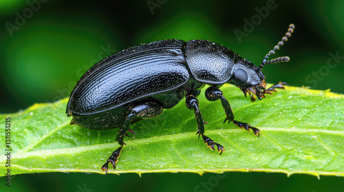 Close-up of shiny black beetle on leaf with detailed texture and antennae