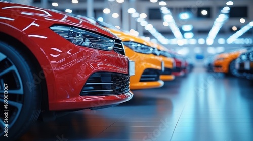 Close-up of shiny new colorful cars lined up indoors under bright lights, showcasing front grills and sleek design in a modern showroom with reflective floor