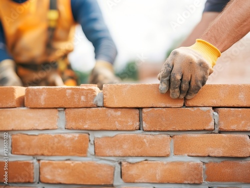 Close-up of skilled workers laying bricks with mortar, demonstrating construction techniques and teamwork in a building project.