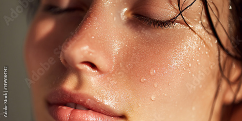 Close-up of skin texture with water droplets, showing a dewy and hydrated appearance, symbolizing freshness, health, and beauty