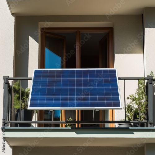 Close-up of small blue polycrystalline solar panel on balcony of apartment building, Munich, Germany