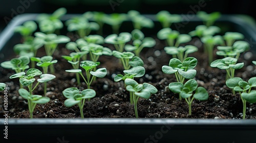 Closeup of small green seedlings sprouting in an indoor garden, macro photography, high resolution, professional photograph, sharp focus, natural lighting